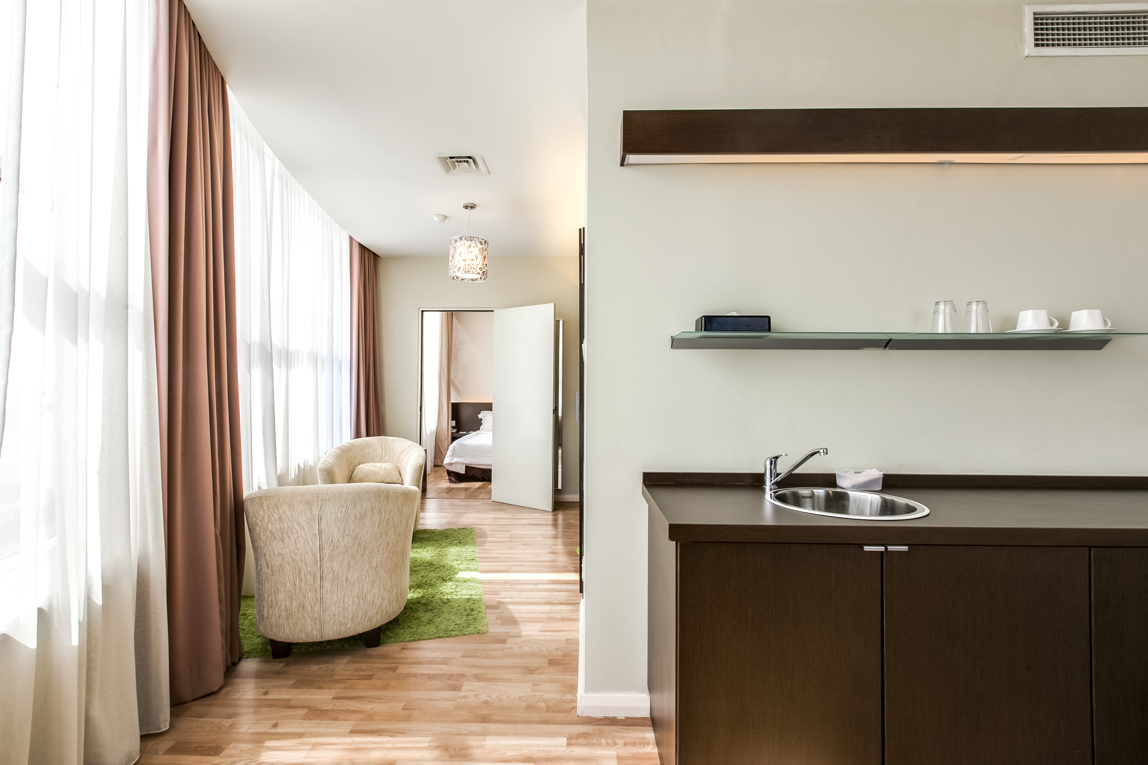 This large suite consists of two rooms connected by a door. Each room has its own en-suite bathroom. Set up perfectly for a family of four, this family room has a kitchenette with a small sink, microwave and dishware. Essentials include plush bedding and rugs, large wardrobe, armchairs, extra luggage space, rain shower with our custom, eco-friendly 3-in-1 citrus body wash, mini fridge, digital safe, free Wi-Fi internet connection, universal socket, bottled water and quiet air-conditioning.