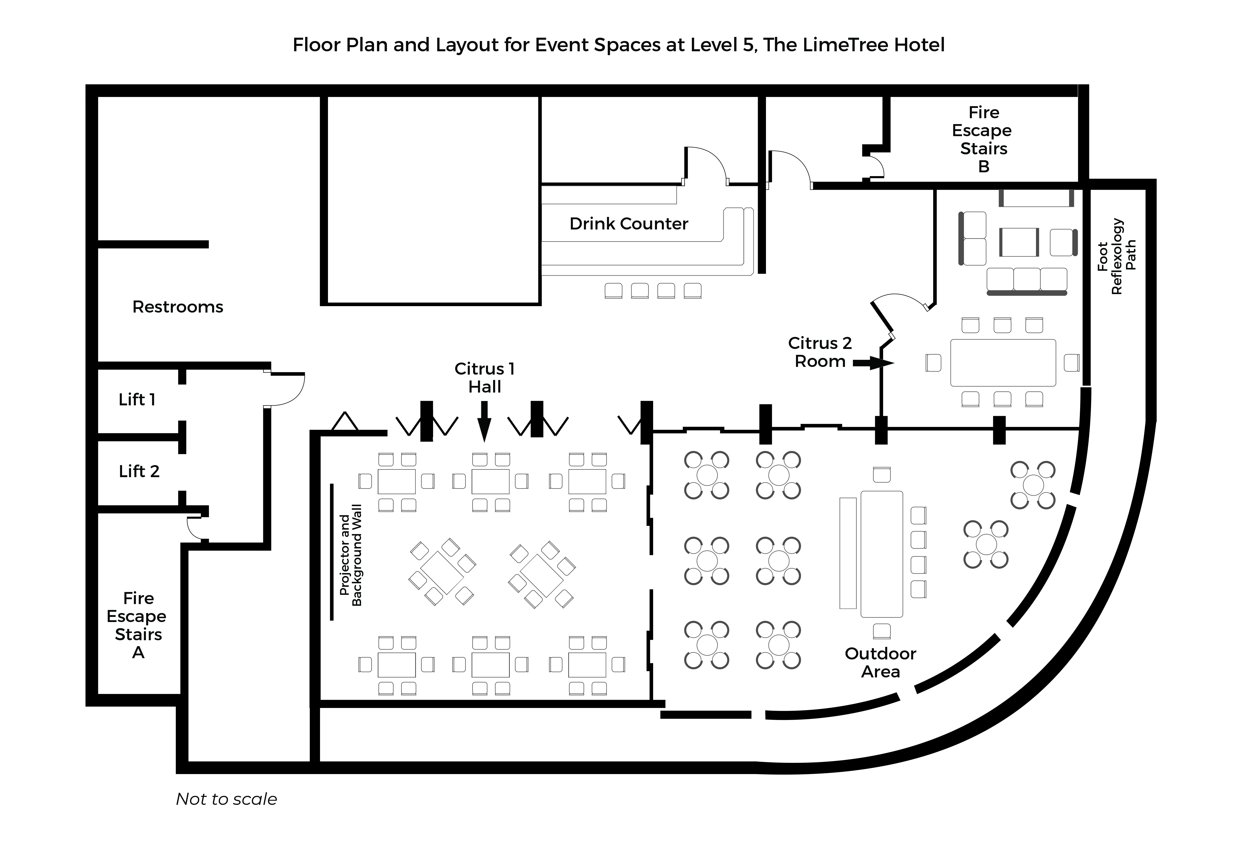 Citrus 1 Indoor Hall Indoor Space 68 sqm / 732 sqft L x W 8m x 8.5m Ceiling Height 5.2m Theatre 60 pax Classroom 40 pax U-Shape 25 pax Dining 60 pax Karaoke Charges apply PA System Included Projector Charges apply Decoration Basic by hotel ASK FOR MEETING & DINING PACKAGES