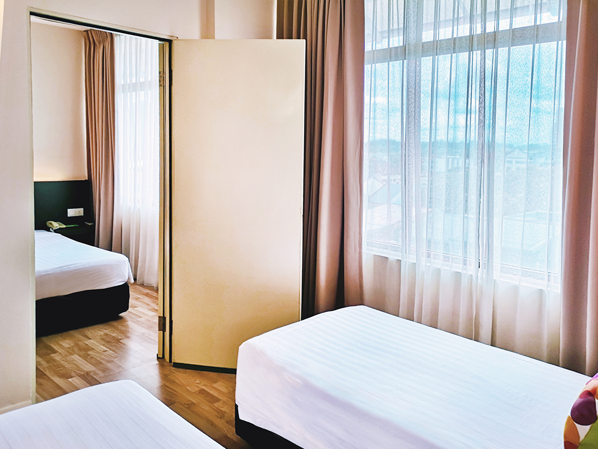 Family Suite Room Size 58m2, city view Bed Type 1 King, 2 Single Max. Guests 4 pax + 1 extra Bath Type 1 tub, 2 showers Wardrobe/Desk Large, armchairs Safebox In-room, digital Mini Fridge In-room Pantry Microwave, Sink Adjoining Door Yes MORE DETAILS